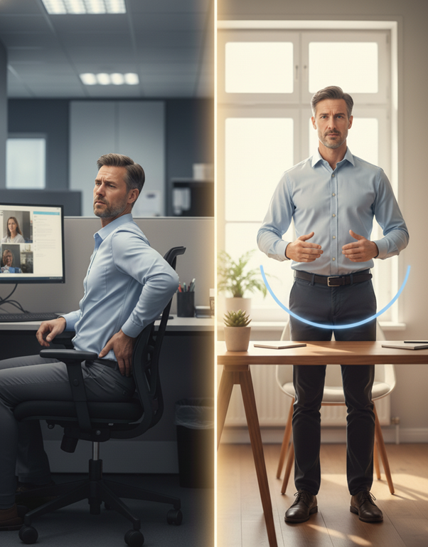 Scientifically-designed 2-minute hourly resets & ergonomic fixes to eliminate stiffness, boost energy, and prevent pain—without leaving your desk. Perfect for remote workers & corporate wellness.